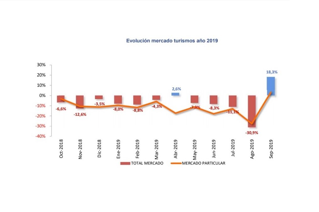 El canal de empresas y el de alquiladoras han logrado amortiguar los descensos de ventas acumulados en el último año (subidas del 121,2%, hasta 5.635 vehículos, y del 30,6%, a 35.223 unidades, en el noveno mes, respectivamente). Mientras que el de particulares se ha mantenido a la baja: las matriculaciones sólo han aumentado un 3,3%, alcanzando los 40.893 vehículos. En el conjunto de los nueve primeros meses, las ventas siguen estando en negativo (-7,4%), contabilizando 965.339 unidades, con descensos en los tres canales citados (del 2,1%, 2,6% y 12,9%, respectivamente).