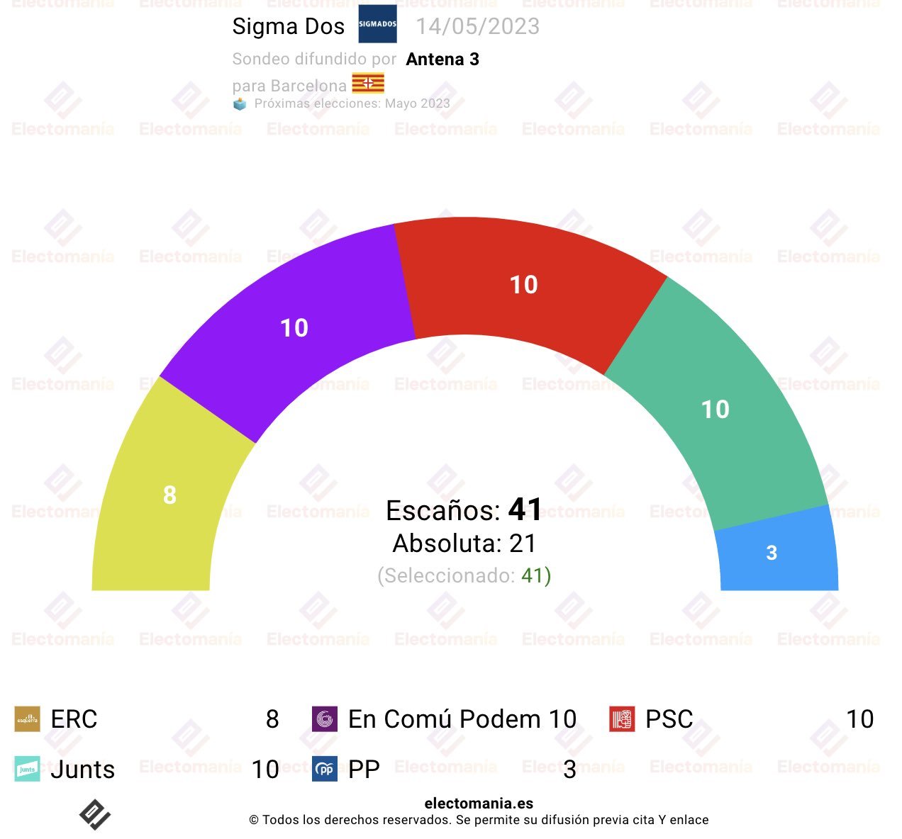La oposición quedaría en manos del PP de Daniel Sirera, y es que Vox se quedaría fuera con el 3,1% del voto. Los populares obtendrían el 6% y 3 asientos en el Ayuntamiento de Barcelona.