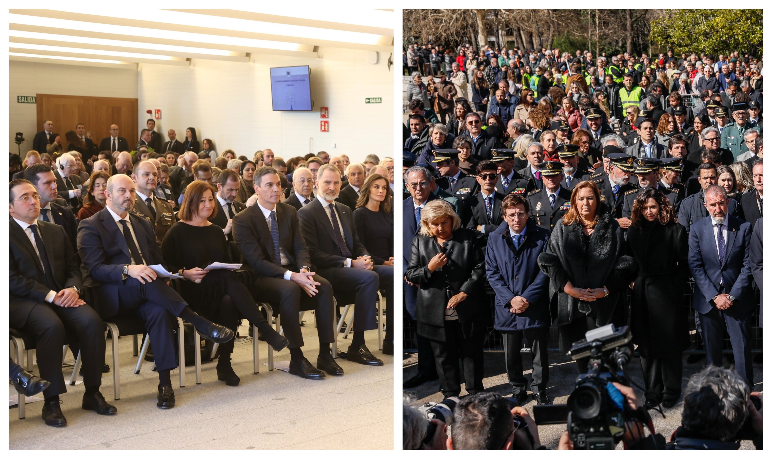 Y todo ello con Pedro Sánchez a su vera, alejado el Jefe del Estado de las víctimas reales, que bramaban contra el presidente del Gobierno y contra el ministro del Interior, Grande Marlaska, en otro escenario madrileño.