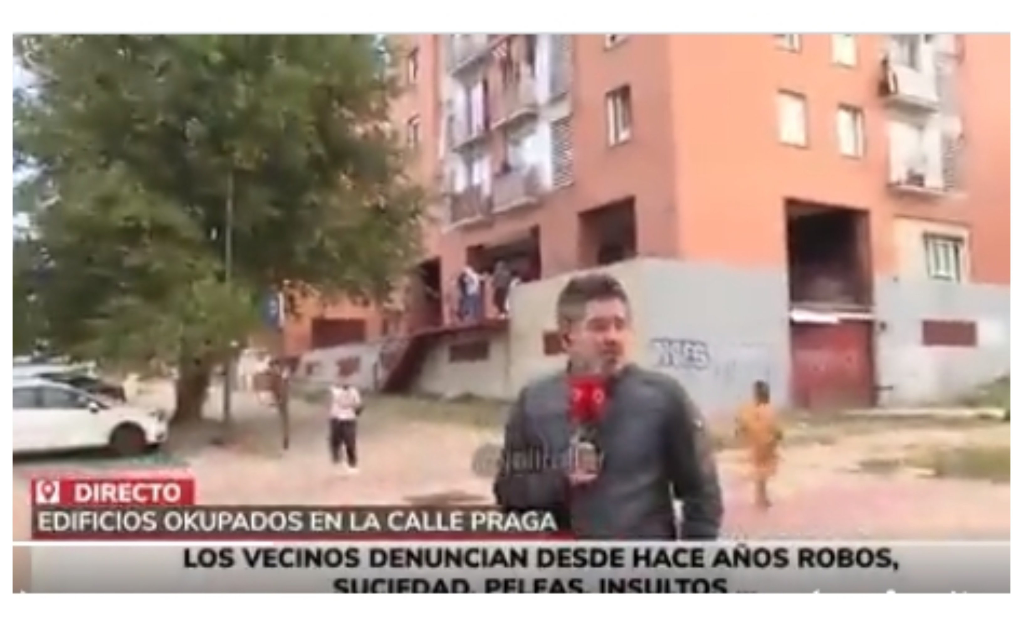 La calle Praga en Alcorcón sufre la okupación de dos de sus edificios. Hasta allí se desplazó un equipo de 'Buenos días' de Telemadrid, que fue agredido con piedras por un grupo de okupas de etnia gitana y sus hijos menores de edad.