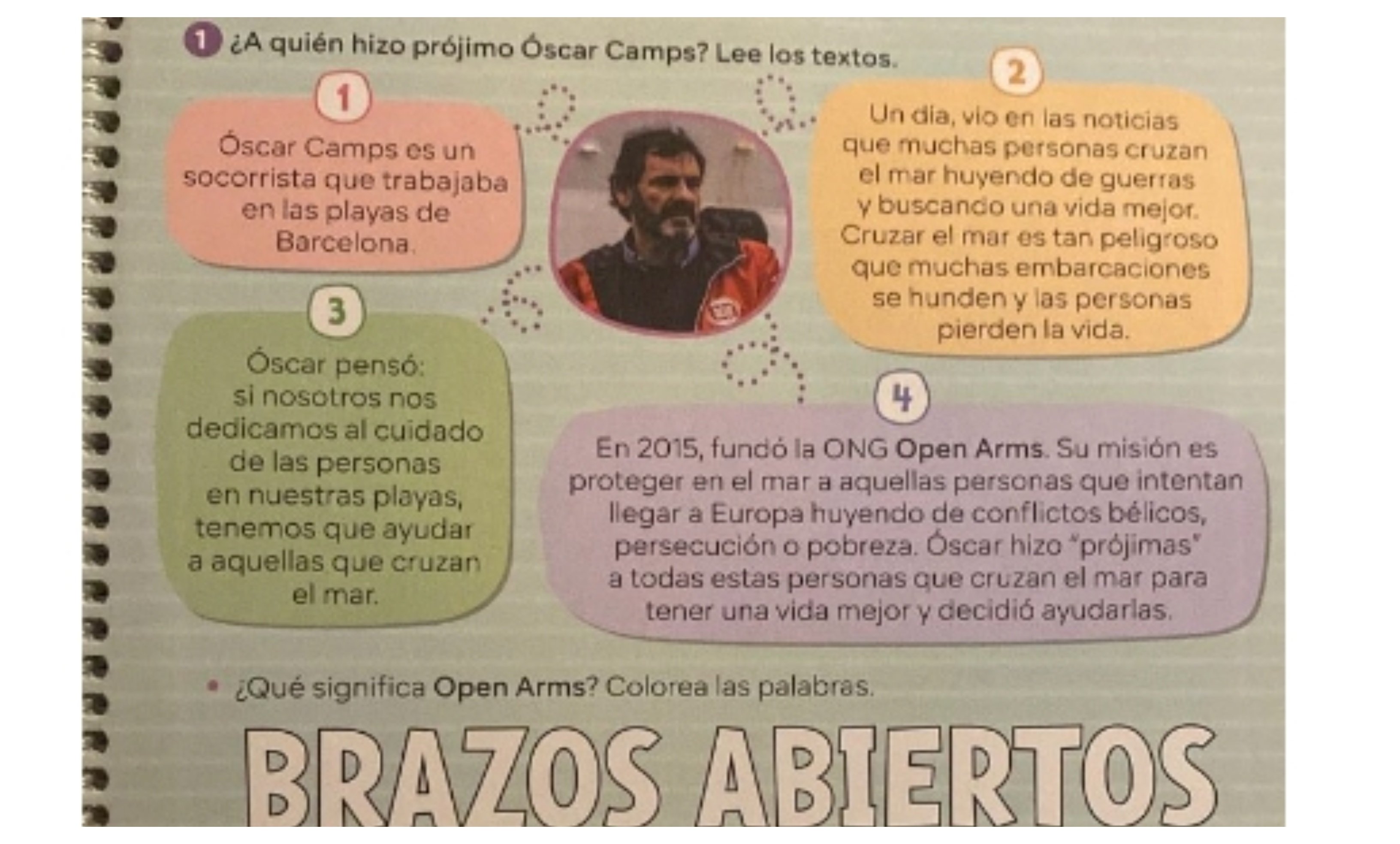 Como venimos insistiendo en Hispanidad las redes son una fuente de información profusa. Así, nos encontramos con tuits que destacan uno de los contenidos de un libro de religión de primaria -alumnos de 6 a 12 años- que toma como ejemplo de quien ayuda a los demás al patrón del Open Arms, Oscar Camps, quien, según este libro, hizo "prójimas" a todas estas personas que cruzan el mar para tener una vida mejor.