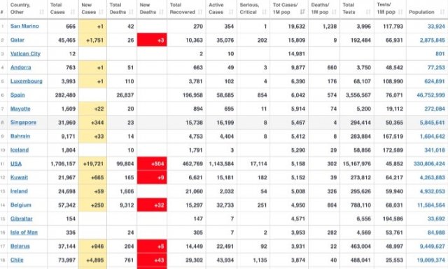 El primero, sobre los 18 países con mayor número de contagiados por millón (Columna Total Cases/ 1M pop). España es el sexto. Nos adelantan, por este orden: San Marino, Catar, Ciudad del Vaticano, Andorra y Luxemburgo. Todos juntos 3,6 millones de habitantes.