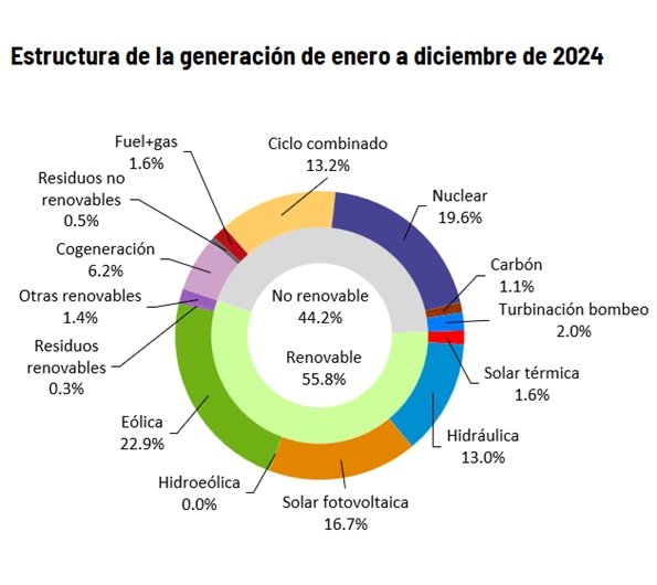 En concreto, la nuclear ha generado el 19,6% de la luz de nuestro país en 2024, situándose sólo por detrás de la eólica (22,9%), y a bastante distancias de otras renovables, como la solar fotovoltaica (16,7%). Una medalla de plata que las centrales nucleares españolas han mantenido en generación eléctrica, pese a diversas recargas de combustible y la parada de Ascó II desde el pasado 11 de noviembre por una reparación. En el entretanto, el Gobierno Sánchez, Redeia e IDAE presumen mucho de récords y producción de energías verdes, pero olvidan que no bastan para garantizar el suministro eléctrico.