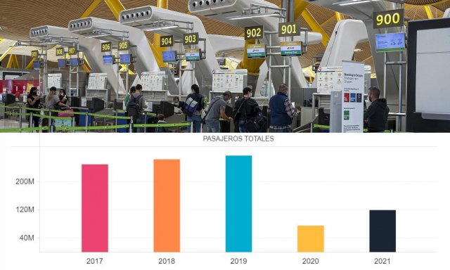 Los aeropuertos de la red de AENA han cerrado el año pasado con casi 119,96 millones de viajeros, recuperando un 43,6% del tráfico prepandemia. La cifra ha aumentado un 57,7% respecto a 2020, aunque aún es un 56,4% inferior a la de 2019, cuando aún no había Covid.