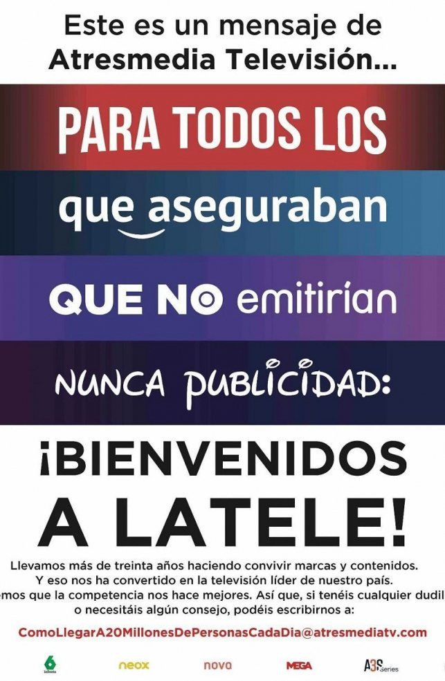 Atresmedia se ha ofrecido a resolver dudas o dar consejos a las citadas plataformas de una forma un tanto sorprendente: con una gigantesca lona publicitaria colocada en uno de los edificios de la plaza Pedro Zerolo, en Madrid. En dicha lona se puede leer: “Este es un mensaje de Atremedia Televisión... para todos los que aseguraban que no emitirían nunca publicidad: ¡Bienvenidos a la tele!”. Además, se reproducen los colores y tipografías de Netflix, Amazon Prime Video, HBO Max y Disney+.