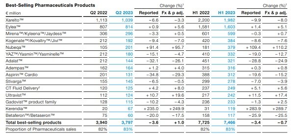 Las ventas del gigante químico y farmacéutico alemán han bajado un 7,4%, a 25.433 millones. Por negocios, el agrícola aportó 13.275 millones (-11%, fundamentalmente por los menores precios y volúmenes en productos a base de glifosato, herbicida que le ha causado varios litigios judiciales tras la compra de Monsanto y milmillonarias provisiones); el farmacéutico, 8.964 millones (-5,1%); y el de medicamentos sin receta, 3.039 millones (+1%). Dentro del negocio farmacéutico destacar que los productos más vendidos siguen siendo el anticoagulante Xarelto (1.982 millones, un 9,9% menos) y también el tratamiento contra la degeneración macular Eylea (1.603 millones, un 1,4% más); y les siguen, completando el podio, los DIU Mirena, Kyleena y Jaydess (599 millones, un 0,3% menos). Tras estos productos están, entre otros: los anticoagulantes Kogenate, Kovaltry y Jivi (384 millones, un 8,6% menos); el tratamiento del cáncer de próstata Nubeqa (379 millones, un 109,4% más); y las pastillas potencialmente abortivas Yaz, Yasmin y Yasminelle (332 millones, un 19% menos).