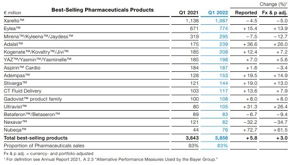 Dentro de la división farmacéutica, entre los diez productos más vendidos se puede ver como Bayer no renuncia al negocio de la muerte -del cual se lucra a través de los DIU Mirena, Kyleena y Jaydess, así como de las pastillas anticonceptivas -que son potencialmente abortivas- Yaz, Yasmin y Yasminelle. Eso sí, afortunadamente, ya no son los productos que más ingresos le aportan, sino que ocupan el tercer y sexto puesto, con 295 millones (-7,5%) y con 198 millones (+7%), respectivamente. Y es que desde hace un tiempo, el producto farmacéutico estrella de Bayer es el anticoagulante Xarelto, que ha tenido unas ventas del 1.087 millones (-4,5%) hasta marzo, y le sigue la medicina para ojos Eylea, con 774 millones (+15,4%).