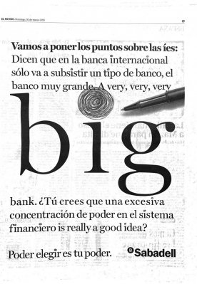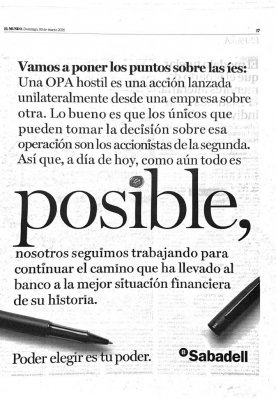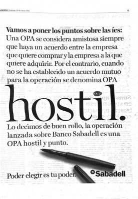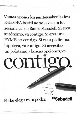 Mientras tanto, el Sabadell ha tirado la casa por la ventana con una muy ambiciosa campaña publicitaria -“Vamos a poner los puntos sobre las íes”-, al contratar cuatro páginas completas consecutivas en los principales diarios, el fin de semana. Oiga, y todas páginas impares, más caras que las pares.