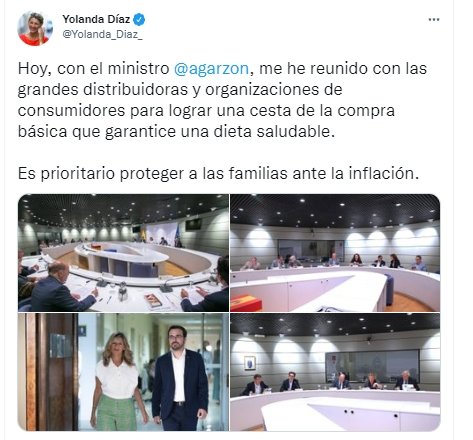 Yolandísima ha defendido una cesta de la compra básica que incluya productos frescos (fruta, verdura, carne y pescado), huevos y lácteos, y una alternativa para los celíacos. Ante las críticas del pequeño comercio (si los grandes hacen más ofertas y descuentos, van a tener menos ventas y clientes), Díaz ha señalado que su propuesta se dirige a la gran distribución, porque “a una pequeña tienda de barrio es muy difícil pedirle más esfuerzos”. También ha escuchado propuestas de sus interlocutores (entre ellas, la rebaja del IVA de algunos productos) y les ha emplazado a otra reunión más larga tras la cita del G-20 de noviembre. Por su parte, Garzón ha ido a lo suyo: le preocupa la tasa de obesidad.