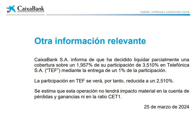Por último, la entrada de la SEPI en Telefónica, así como la de los árabes de STC, tan inquietante como la SEPI o más, aunque una entrada no se justifica por la otra sino en el cinismo propio de La Moncloa, ¿qué repercusión tendrá sobre el actual núcleo duro de la operadora, formado por Caixabank y por BBVA? El hecho relevante (ver imagen superior) enviado ayer lunes por Caixabank a la CNMV no tiene nada que ver con esto: se trata del proceso según el cual el banco abandona Telefónica y su principal accionista, Criteria, toma la participaciòn que el otro deja, siempre por encima del 5%. Ahora mismo, tras la venta del 1% de Telefóncia por parte de Caixabank, entre la entidad y la sociedad de participaciones industriales Criteria, suman un 5,1%