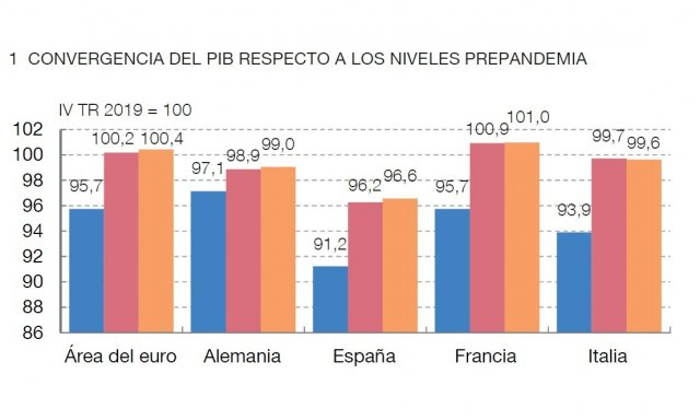 Al parecer, Hernández de Cos es un ultra. A los hechos. Lean el siguiente párrafo del precitado informe: "El nivel del PIB se encuentra más alejado de su nivel previo a la pandemia en España que en el resto del área del euro. Todos los países experimentaron un fuerte retroceso de la actividad al comienzo de la pandemia, a raíz de los primeros confinamientos, así como un intenso repunte posterior. Sin embargo, las diferencias en términos de la distancia del PIB al final de 2021 con respecto al nivel precrisis son notables. España es, de entre todas las economías del área del euro, la más rezagada (véase gráfico 1.15.1). En concreto, el PIB del primer trimestre de 2022 se situó un 3,4% por debajo del PIB prepandemia, mientras que en el conjunto del área del euro ya se ha rebasado dicho nivel en 0,4 pp".