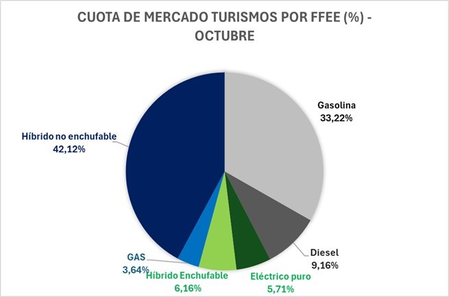 Respecto a las ventas de turismos eléctricos, la cuota se mantiene en niveles mínimos: 5,7% del total entre enero y octubre. De hecho, sólo en el décimo mes del año, las ventas de eléctricos puros se han reducido un 5,7%, a 4.768 unidades, lejos del desplome del 25,6% que registraron en agosto; mientras que la sventas de híbridos enchufables han crecido un 3%, a 5.140. En total, en el acumulado de los diez primeros meses, las ventas de turismos electrificados han ascendido a 90.137 unidades (+0,4%), lo que supone una cuota del 10,88%, cinco décimas menor a la de hace un año.