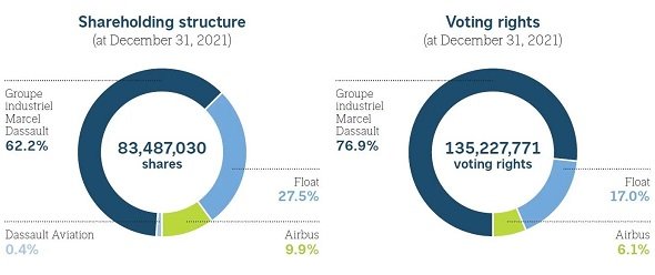 El fabricante francés de aviones militares y jets privados, destaca por sus modelos Rafale y Falcon (el que tanto gusta a Pedro Sánchez, como saben), respectivamente. Asimismo, es el coordinador elegido por Emmanuel Macron en el proyecto de avión de combate europeo FCAS, que comparte con España y Alemania (donde los respectivos coordinadores son Airbus e Indra), y que está llamado a sustituir al Rafale y al Eurofighter para 2040. Eso sí, hay que destacar que el Estado francés no está presente en su accionariado, algo raro teniendo en cuenta lo que le gusta tener participaciones en las empresas galas, aunque sí lo estuvo en el pasado, actualmente su accionariado se reparte entre: Groupe Industriel Marcel Dassault (62,2%), free float (27,5%), Airbus (9,9%) y empleados (0,4%). Al hilo de esto, conviene recordar que el gigante aeronáutico europeo conserva el 9,9%, despues de haber hecho desinversiones hace unos años, y que antes se llamaba EADS -el cual surgió de la fusión de la francesa Aérospatiale Matra (a la que el Estado francés había traspasado sus acciones en Dassault), la alemana Dasa y la española CASA-.