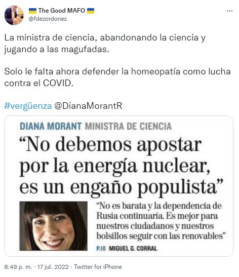 “Claramente no creo que debamos apostar como país por la energía nuclear. Entiendo que estos cambios que se están produciendo en Europa no responden a una verdadera vocación y voluntad, sino a una necesidad de cubrir la falta de suministro de su principal fuente de energía por culpa de la guerra de Putin”, señala Morant en su entrevista. También pide que “la ciudadanía que no se deje engañar por las soluciones simplistas y populistas que vienen al ataque. Y por si esto no bastara, refiere que la nuclear no es barata y seguiríamos dependiendo de Rusia. Es mejor para nuestros ciudadanos y para nuestros bolsillos seguir con las energías renovables”. La titular de Ciencia e Innovación debería tener en cuenta que la Sociedad Nuclear Española (SNE) señala que la producción de uranio está muy diversificada y que a nuestro país llega no sólo desde Rusia, también de Australia, Canadá, EEUU, Egipto, Francia, Groenlandia, India, Kazajistán, Namibia, Nigeria, Noruega, Rusia, Sudáfrica, Uzbekistán y Venezuela.