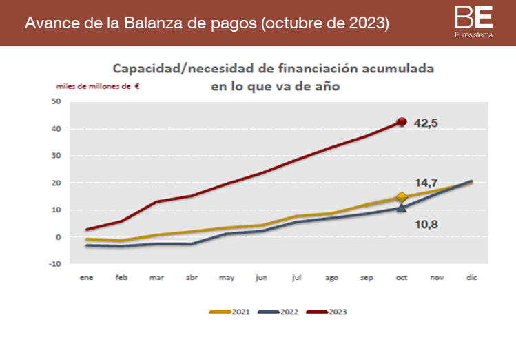 Pues bien, según el organismo que dirige Pablo Hernández de Cos, la necesidad de financiación de la economía española se ha disparado y ha pasado de 18.900 millones de euros a 51.400 millones desde noviembre de 2022 a noviembre de 2023. Una bestialidad. De nada sirve que en la comparativa mensual -noviembre de 2023 frente a noviembre de 2022- la necesidad de financiación se hay reducido y haya pasado de 5.200 millones a 4.100 millones. Sigue siendo una barbaridad.
