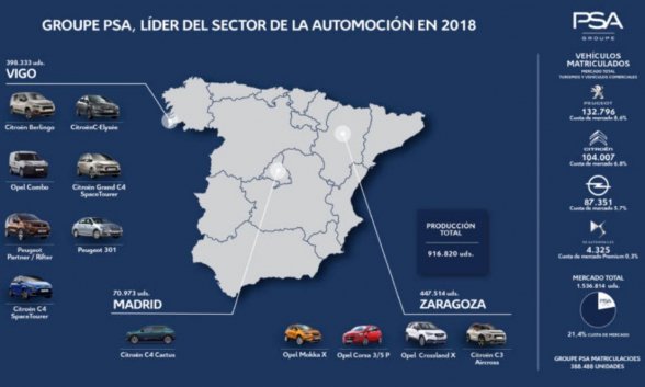 Y todo ello, con sólo tres fábricas (Vigo, Zaragoza y Madrid), donde se producen 12 modelos, algo que no está nada mal teniendo en cuenta que tiene 12 plantas en su país natal (Francia). En 2018, PSA fabricó 916.820 vehículos en España, es decir, el 32,5% del total, de los que el 86% se dedicaron a exportación, y que se repartieron de la siguiente manera: 447.514 unidades de cuatro modelos se produjeron en Figueruelas (Zaragoza); 398.333 de siete modelos, en Vigo (Pontevedra) y 70.973 del modelo Citroën C4 Cactus en Madrid, que tiene la exclusiva mundial de su fabricación.