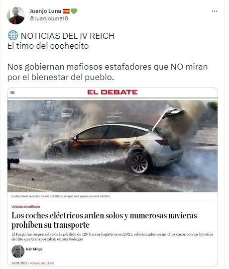 6.000 galones = 23.000 litros. Es el agua que necesitaron los bomberos para apagar la batería que se incendió de un coche eléctrico https://t.co/2XXSO6KYKc