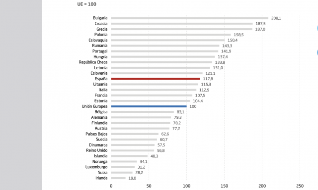 Pues bien: según el informe ‘Competitividad fiscal 2023’ realizado por el Instituto de Estudios Económicos (IEE), publicado en abril de este año, "España realiza (con datos de 2022) un esfuerzo fiscal un 17,8% superior al de la Unión Europea, que, ya de por sí, es bastante elevado en el contexto internacional, muy por encima del de otros países de la OCDE. Entre las grandes economías avanzadas, ninguna presenta un esfuerzo fiscal superior al de nuestro país".