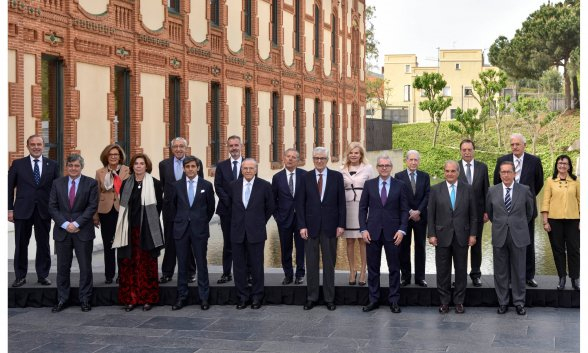 Arriba (de izq. a dcha): Luis Carreras del Rincón (designado por Cruz Roja Española), Asunción Ortega Enciso, Artur Santos Silva, Marc Murtra, Javier Godó, Isabel Estapé, Shlomo Ben-Ami, Eugenio Gay Montalvo (designado por Cáritas Diocesana de Barcelona), Francesc Homs Ferret, Elisa Durán Montolío (directora general adjunta).
