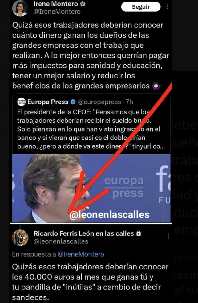 Lo que no se esperaba Montero es que Ricardo Ferris no tendría problemas en responder: "Quizás esos trabajadores deberían conocer los 40.000 euros al mes que ganas tú y tu pandilla de 'inútilas' a cambio de decir sandeces".