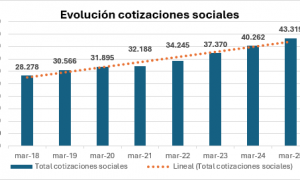 Si se toman como referencia los datos del último ejercicio que no estuvo afectado por la pandemia del Covid, 2019, el incremento de las cotizaciones es de 12.752 millones de euros (un 41,72% más). En el análisis mensual comparativo se observa que en marzo los ingresos por cuotas se cifraron en 14.416 millones de euros, 3.974 millones de euros más que el mismo mes de 2019.