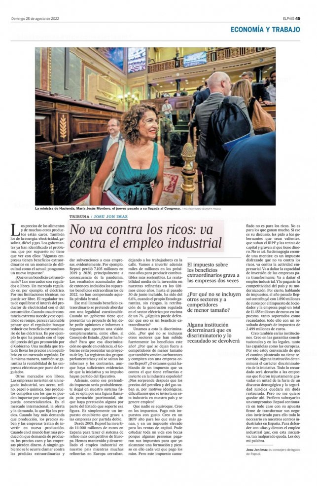 Lo hace en un artículo escrito en El País, algo que resulta bastante llamativo, teniendo en cuenta que este periódico -junto a la Cadena SER y RTVE- es el gran vocero y aplaudidor del Gobierno Sánchez. Imaz critica que perjudicará a la competitividad, aunque en Repsol seguirán defendiendo con uñas y dientes el empleo industrial, como muestran sus proyectos en la refinería de Bilbao o en la de Cartagena, por ejemplo. De hecho, desde 2008, han invertido 14.000 millones de euros para tener el sistema de refino más competitivo de Europa, manteniendo y desarrollando el empleo industrial (11.000 personas hace algo más de un año, de los que 5.600 eran empleos directos a finales del pasado mayo), mientras muchas refinerías del continente cerraban, dejando a los trabajadores en la calle.