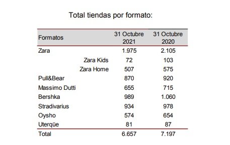 Inditex ha terminado octubre con un total de 6.657 establecimientos y todos ya han reabierto sus puertas tras las restricciones Covid, pero son 540 menos (-7,5%) que hace un año, pues pese a que sigue haciendo aperturas, también cuenta con un plan de optimización que incluye absorciones y cierres de los pequeños, priorizando los más grandes. Eso sí, la cifra total es ligeramente superior a la que registraba al final de su primer semestre fiscal, que fue de 6.654, siendo así el primer incremento tras seis trimestres consecutivos a la baja.