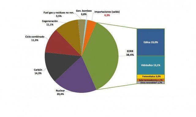 El año pasado, la producción eléctrica total fue de 260.906 GWh (gigavatios-hora). La mayor parte procedió, una vez más, de la energía nuclear (20,4%), le siguieron la eólica (19%), el carbón (14,3%) y la hidráulica (13,1%), según las cifras dadas en la presentación del ‘Balance Energético 2018 y Perspectivas 2019’ del Club Español de la Energía. Y entre el resto de fuentes de energía, destacaron: el ciclo combinado (11,5%) y la cogeneración (11,1%).
