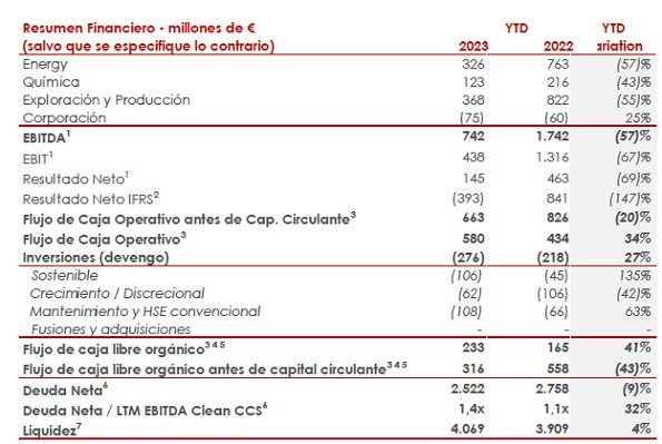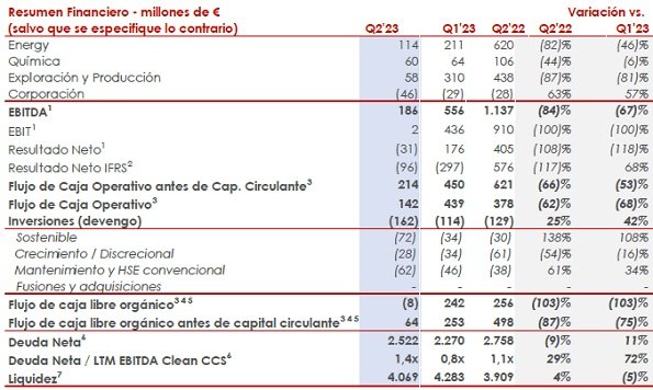 El resultado neto, según la normativa internacional NIIF (también llamada IFRS), de la petrolera que es propiedad en un 61,5% del fondo soberano de Abu Dabi -Mubadala- y en un 38,5% del fondo de inversión estadounidense The Carlyle Group, a cierre del primer semestre, ha arrojado unas pérdidas muy cuantiosas, de -393 millones de euros. Esta cifra ha sido muy inferior al beneficio neto a IFRS del primer semestre de 2022, que alcanzó los 841 millones de euro, y así la comparativa interanual se traduce en un hundimiento del resultado del 147%. Resulta inquietante, cuanto menos, que el grupo presente en paralelo otro resultado neto denominado Clean CCS, el cual dice que excluye el efecto de extraordinarios e inventarios, pero que tampoco le salva de la quema, ya que en iguales términos comparativos, ha descendido en un 69%. Además, está obligado por normativa a presentar sus resultados de acuerdo con la normativa IFRS, por lo que no entendemos estas ganas de confundir al lector, con el fin de hacer parecer que el resultado en el período no ha sido tan malo.