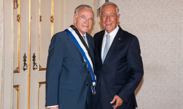 El presidente de Portugal, Marcelo Rebelo de Sousa, ha impuesto a Isidro Fainé, presidente de la Fundación La Caixa, la máxima condecoración lusa para aquellos que no sean jefes de Estado: la Gran Cruz de la Orden del Infante Don Henrique.