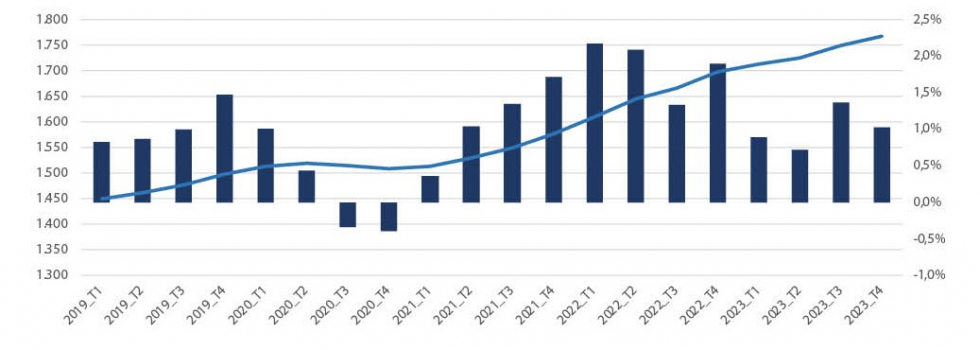 La estadística Tinsa publica los datos del precio medio de la vivienda nueva y usada correspondientes al último trimestre del año en España: se registra un incremento interanual del 4,1% el cuatro trimestre y del 1% respecto al trimestre anterior. Lo que supone una moderación en el encarecimiento, frente al 5% interanual del tercer trimestre, el 4,9 % del segundo y 6,3 % del primer trimestre del año, y sitúa la variación media en el conjunto del año 2023 en un 5,1 %: "El encarecimiento de la vivienda se modera al 4,1 % interanual en el cuarto trimestre", advierte la estadística Tinsa IMIE General y Grandes Mercados publicada hoy.