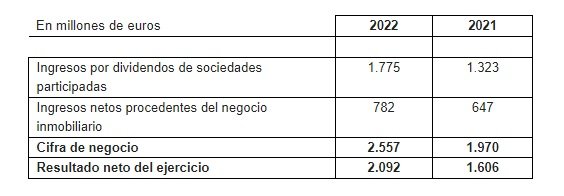 La partida de ingresos se compone de 1.775 millones en ingresos por dividendos de las sociedades participadas (1.719 millones de Inditex y 56 millones del resto), frente a los 1.323 millones que recibió en 2021; y otros 782 millones de los ingresos netos del negocio inmobiliario, por encima de los 647 millones facturados un año antes