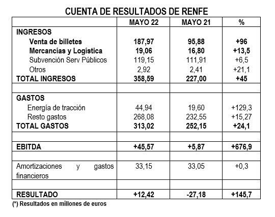 El presidente de Renfe, Isaías Táboas, tiene razones para estar contento, pues las cifras de mayo son un primer paso para decir adiós definitivamente a los números rojos. Asimismo, mejoran las de abril, cuando aún se registraron unas pérdidas de 1,5 millones, 30,5 veces inferiores, pese a la vuelta a beneficios de Renfe Viajeros, que ganó 3,74 millones, por el aumento del tráfico. Y no sólo se debe al buen comportamiento de mercancías y mantenimiento, sino también de los ingresos: los de la venta de billetes se han duplicado (+96%), hasta 187,47 millones, pese a que en alta velocidad ya tiene competencia del AVE low cost Ouigo del operador ferroviario francés SNCF (y dento de unos meses sumará la de Iryo, el tren de alta velocidad de Intermodalidad de Levante S. A. (Ilsa) -la cual es en un 55% propiedad de Air Nostrum y en un 45% de Trenitalia-); y los de mercancías y logística han subido un 13,5%, a 19,06 millones. A estos se suman los ingresos de la subvención de servicios públicos, que ha ascendido a 119,15 millones, y así el total de ingresos de Renfe se ha situado en 358,59 millones, un 45% mayores a los obtenidos en mayo de 2021.