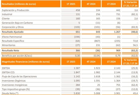 Por su parte, el resultado bruto de explotación (ebitda) ha caído un 25,9%, hasta 1.587 millones. El ebitda CCS (indicador que mide el rendimiento operativo ajustado al coste de reposición de las materias primas y otros insumos) ha descendido un 13,9%, a 1.847 millones. El resultado neto se ha desplomado un 62,2%, a 366 millones; y en términos ajustados, la caída ha sido del 48,6%, a 651 millones. El negocio de Exploración y Producción ha aportado 458 millones (+3,6%) al resultado, muy por encima del negocio Cliente (160 millones, un 2,6% más), el negocio Industrial (131 millones, un 82,1% menos) y el negocio de Generación Baja en Carbono (el cual ha logrado un beneficio de 5 millones, frente a las pérdidas de 6 millones de hace un año).
