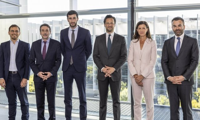 Esta es la fotografía tras la firma. Aparecen: Charles Portalier, de Crédit Agricole Assurances; Josu Jon Imaz; Quentin Le-Cloarec, también de Crédit Agricole Assurances; Peter Schümers, de EIP; María Víctoria Zingoni, directora general de Cliente y Generación Baja en Carbono de Repsol; y Roland Dörig, de EIP.
