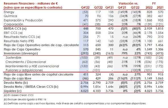 La capacidad de gestión de recursos, medida a través del ebitda, ha seguido su senda ascendente desde 2020: se ha disparado un 62% entre 2021 y 2022, a 2.939M€, por las mejores condiciones de mercado, los mayores precios del crudo, el incremento de los márgenes de refino y las iniciativas de optimización