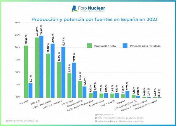 En este contexto, Foro Nuclear reafirma que la nuclear es fuente de estabilidad, robustez y competitividad, a la vista de los resultados provisionales de 2023 obtenidos con datos de Redeia. El año pasado, la nuclear aportó el 20,34% de la producción de electricidad, siendo la segunda fuente de generación tras la eólica, pero con muchísima menos potencia (7.117 megavatios, el 5,71% del total) y de forma mucho más eficiente y competitiva al funcionar el 87,06% de las horas del año, y ayudando a contener el precio de la luz y evitando 20 millones de toneladas de CO2. En concreto, la nuclear funcionó 7.626 horas frente a las 2.040 de la eólica o las de la solar térmica y las 1.515 de la solar fotovoltaica, o sea, muchísimas menos horas aunque cuentan con unas respectivas potencias mucho mayores (de 24,65%, 1,85% y 19,77% sobre el total).