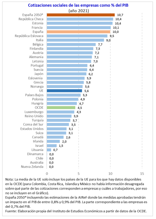 El informe destaca que las cotizaciones sociales de las empresas españolas en referencia al PIB "ya estaban antes de la reforma entre las más elevadas de la Unión Europea y de la OCDE". Asimismo denuncian que una vez que se incorporen todos los cambios aprobados, "las cotizaciones sociales de las empresas españolas frente al PIB superarán los máximos actuales existentes tanto dentro de la OCDE como de la Unión Europea", por lo que "no se puede descartar la necesidad de que haya que adoptar medidas por el lado del gasto".