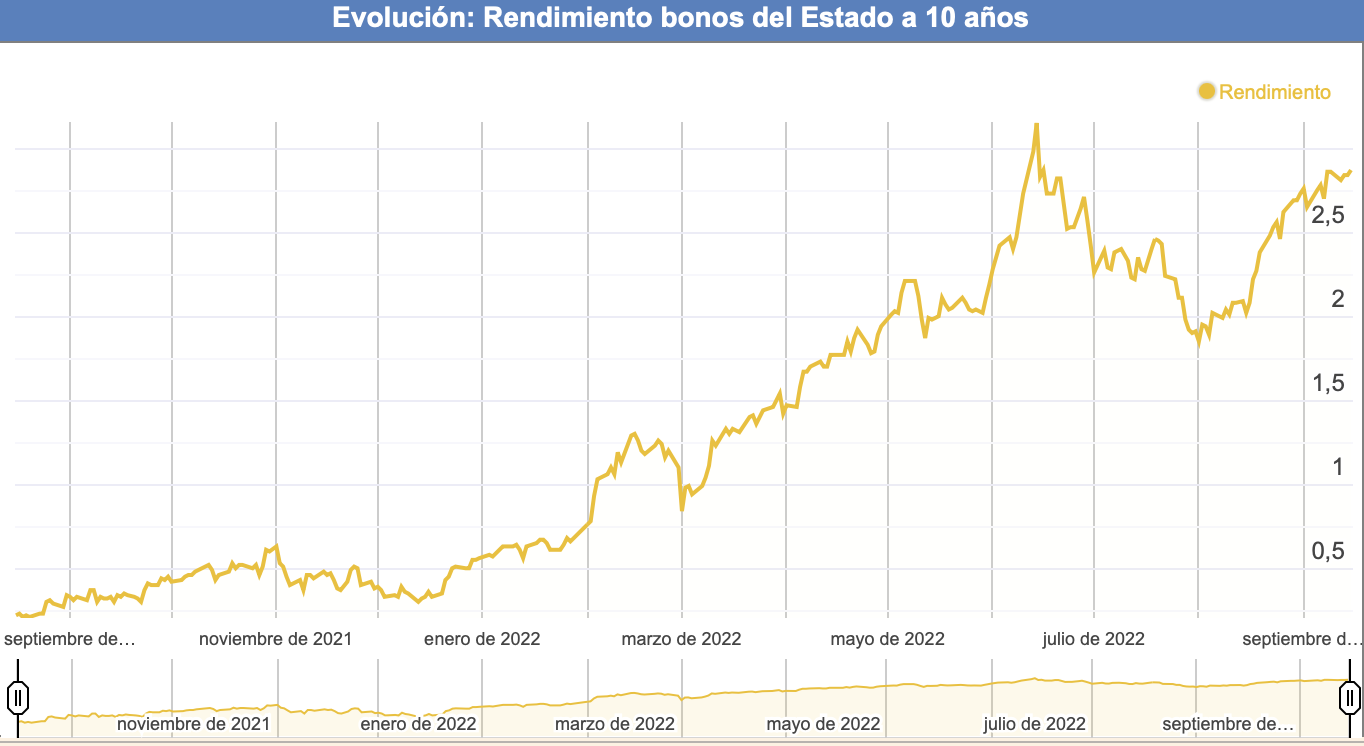 Según recoge Expansión, el bono español a diez años ofrece hoy una rentabilidad del 2,88%; frente al aproximadamente 0,5% que tenía en noviembre del año 2021.