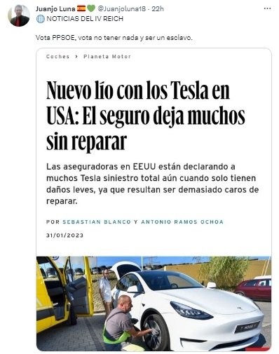 Paralelamente, conviene no olvidar los problemas que siguen acumulando los eléctricos. Al caro precio y la falta de ayudas eficaces se suma: el fuerte retraso en el despliegue de puntos de recarga (en España puede llegar a dos años por unidad), que no ahorran energía, sus baterías se fabrican con minerales extraídos en algunos países donde se explota a personas y China controla gran parte de esos minerales, y por ahora, no permiten que la Guardia Civil pueda ayudarte. Asimismo, también están teniendo dificultades con los neumáticos (son más caros y duran menos que los de coches de combustión), hay baterías que arden y para apagar el incendio los bomberos llegaron a emplear ¡23.000 litros de agua! En EEUU muchas aseguradoras están declarando a muchos Tesla siniestro total pese a tener daños leves porque son caros de reparar y en España hay dificultades para encontrar talleres y mecánicos especializados en este tipo de vehículos y aún no hay una solución para sus residuos y el reciclaje de las baterías.