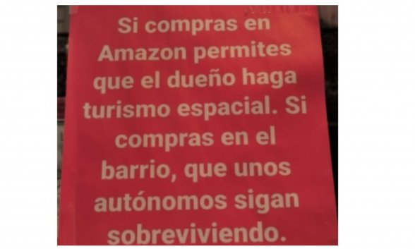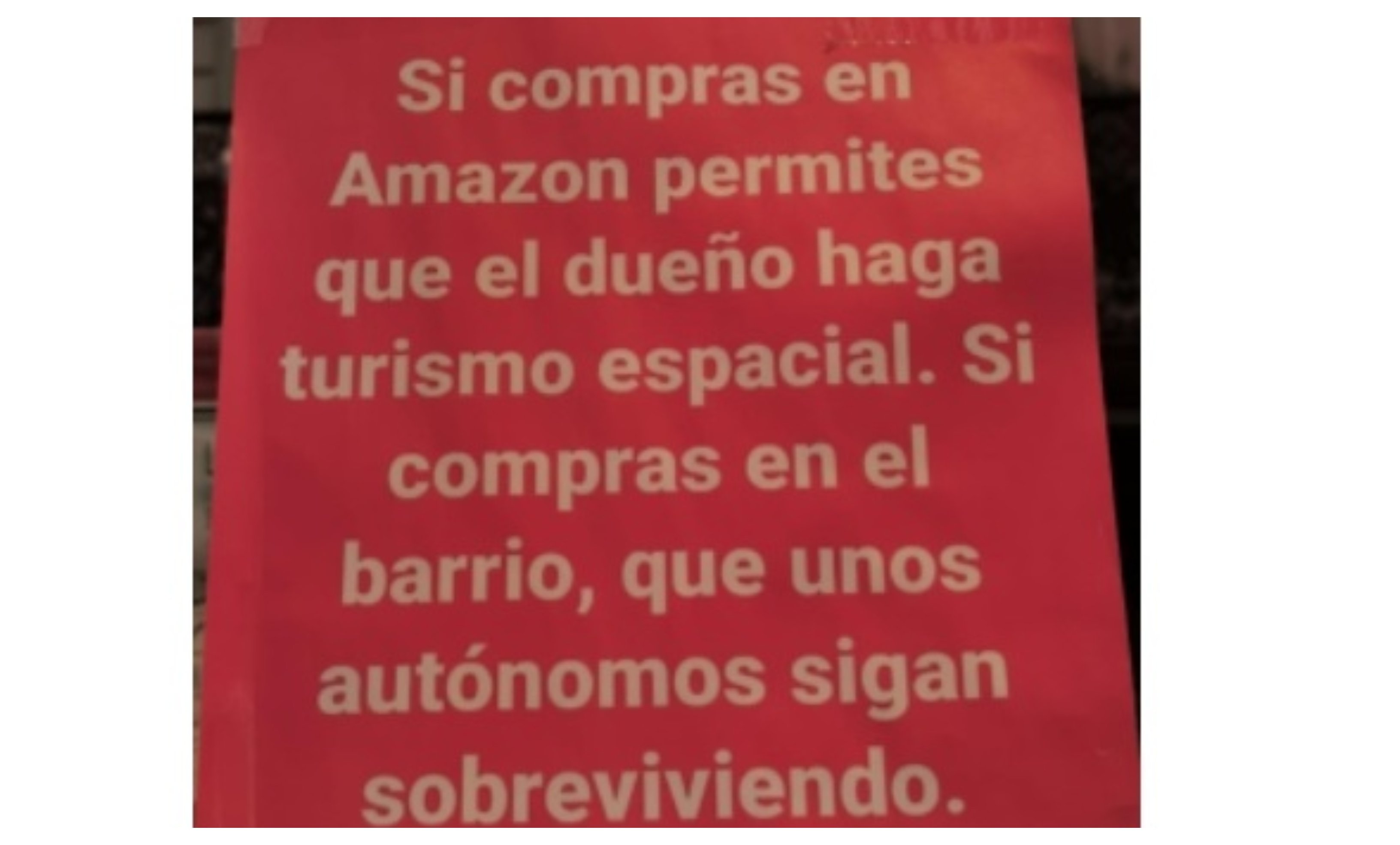 No es una imagen, es una frase. En concreto 21 palabras que dicen mucho más que algún ensayo de 210 páginas, o de 2.100. Nos propone, con un ejemplo sobre el amigo Jeff Bezos, que ayudemos al pequeño, al tendero de la esquina -que anda asfixiado- en lugar de comprar en Amazon.