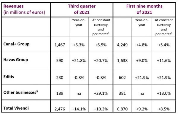 Ahora, la filial audiovisual Canal+ y el negocio publicitario Havas Group se han convertido en las divisiones que más ingresos aportan a Vivendi en los nueve primeros meses: en concreto, 4.249 millones (+4,8%) y 1.638 millones (+9%). Les sigue la editorial francesa Editis (que adquirió a Planeta hace unos años), con 602 millones (+21,9%). Estas tres divisiones han sido las principales responsables de que los ingresos de Vivendi hayan aumentado un 9,2% hasta septiembre, al presentar unos crecimientos respectivos de 195 millones, 135 millones y 108 millones.