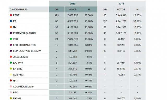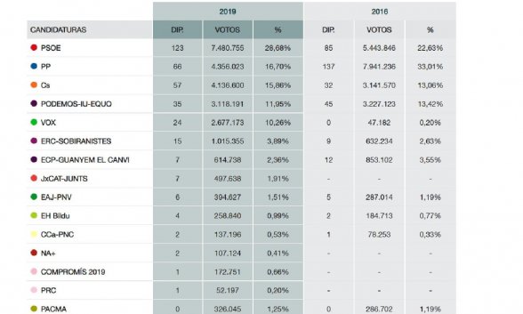 En total, 15 grupos se repartieron el conjunto de los diputados del Congreso. Los mayoritarios, PSOE (123), PP (66), Cs (57), Podemos (35) y Vox (24), se hicieron con 305 representantes. Por su parte, ERC logró 15 escaños; ECP y JxCAT, siete cada uno; EAJ-PNV, seis; Bildu, cuatro; CCa-PNC, dos, al igual que NA+ y, tanto Compromís como PRC consiguen un diputado en el Congreso cada uno.