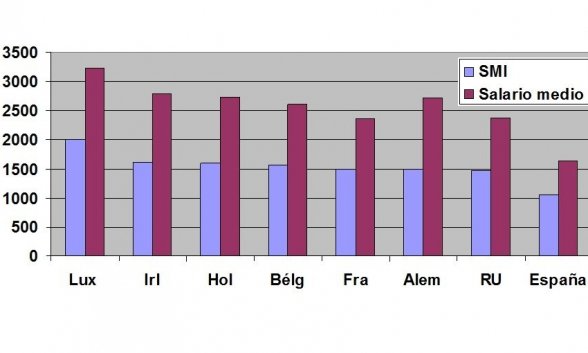En SMI, Luxemburgo (1.999 euros brutos al mes), Irlanda (1.614 euros), Holanda (1.594 euros), Bélgica (1.563 euros), Francia (1.498 euros), Alemania (1.498 euros) y Reino Unido (1.464 euros) superan a España, según los últimos datos de Eurostat, correspondientes al pasado julio. Como saben, en nuestro país, el SMI subirá 164 euros al mes, pasando de 735,9 euros brutos al mes a 900 en 14 pagas (o bien, a 1.050 euros mensuales en 12 pagas), algo que no disminuirá mucho las diferencias con sus vecinos europeos: el español será 949 euros inferior al luxemburgués y 448 euros menor que el alemán y el francés.