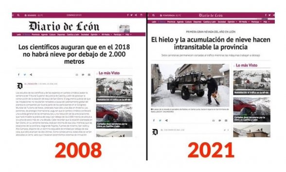 En 2008, los ponentes en el Congreso Mundial de Turismo de Nieve auguraron que el cambio climático provocaría una subida general de las temperaturas y una reducción de las precipitaciones que haría inviable la práctica de esquí por debajo de los 2.000 metros en poco más de una década. De hecho, el pasado domingo, en la provincia leonesa siete carreteras estaban cortadas al tráfico y con las máquinas quitanieves trabajando a destajo, por ejemplo, en La Baña (pueblo situado a 995 metros de altitud) o en el puerto de Monteviejo (1.433 metros), y también había nieve en la ciudad de León (837 metros). ¡Menos mal que tenemos científicos y expertos climáticos!