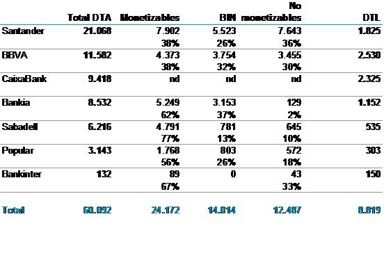 negociación pero al fin hay acuerdo sobre los activos fiscales diferidos (DTA) de la banca española entre el Gobierno Rajoy y la Comisión Europea. Al final, el Ministerio de Economía cede en principios pero con una penalización mínima.Fíjense en el cuadro, sobre todo en la columna de monetizables, que es la relevante. 24.172 millones de DTA