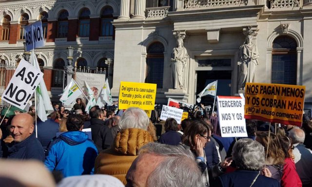 Las organizaciones agrarias UPA, COAG y ASAJA se han concentrado en una protesta frente al Ministerio de Agricultura, Pesca y Alimentación en Madrid para denunciar la "pésima" situación que atraviesa el sector, informa RTVE.