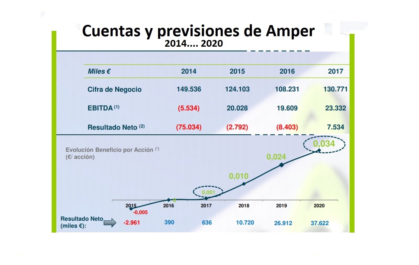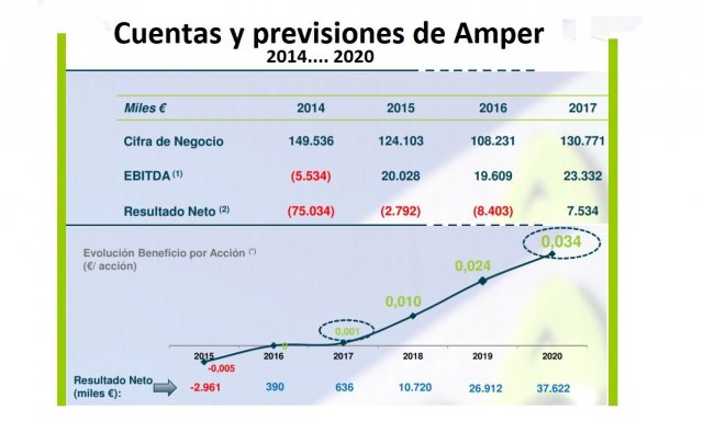 Amper deja atrás su travesía en el desierto, que ha durado tres años, después de poner las bases en 2017 a un futuro más respirable, digamos. Ese es el principal mensaje que ampara el nuevo plan estratégico (2018-2020), comunicado este jueves a la CNMV y al que los inversores han respondido positivamente: los títulos suben en bolsa en torno al 27%, hasta 0,23 euros, cota que alcanzará en 2019 según sus propios cálculos (en la imagen).