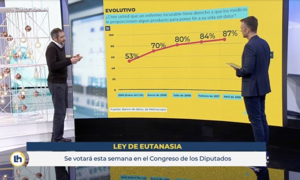 Extenso apartado, como decimos, a cargo de José Pablo Ferrándiz, investigador principal de Metroscopia. El experto, sin embargo, sorprendió a la audiencia exhibiendo la evolución de la opinión de los españoles acerca de la eutanasia, pero sólo hasta abril de 2019. Rabiosa actualidad la suya.