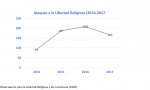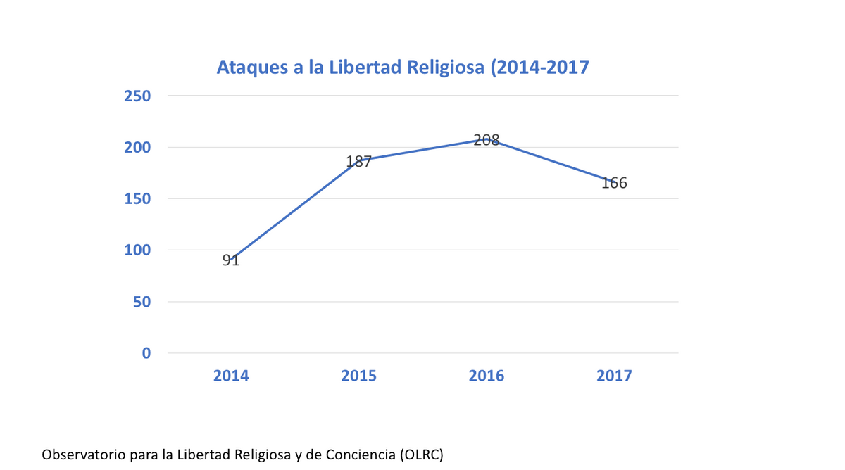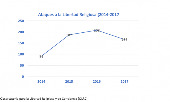 Con respecto a 2016, se ha reducido el número de casos, lo cual es beneficioso para la libertad religiosa. En concreto, en 2016 hubo 208 casos, mientras que en 2017 el número ascendió a esos 166. En 2015 hubo 187 y en 2014 un total de 91.